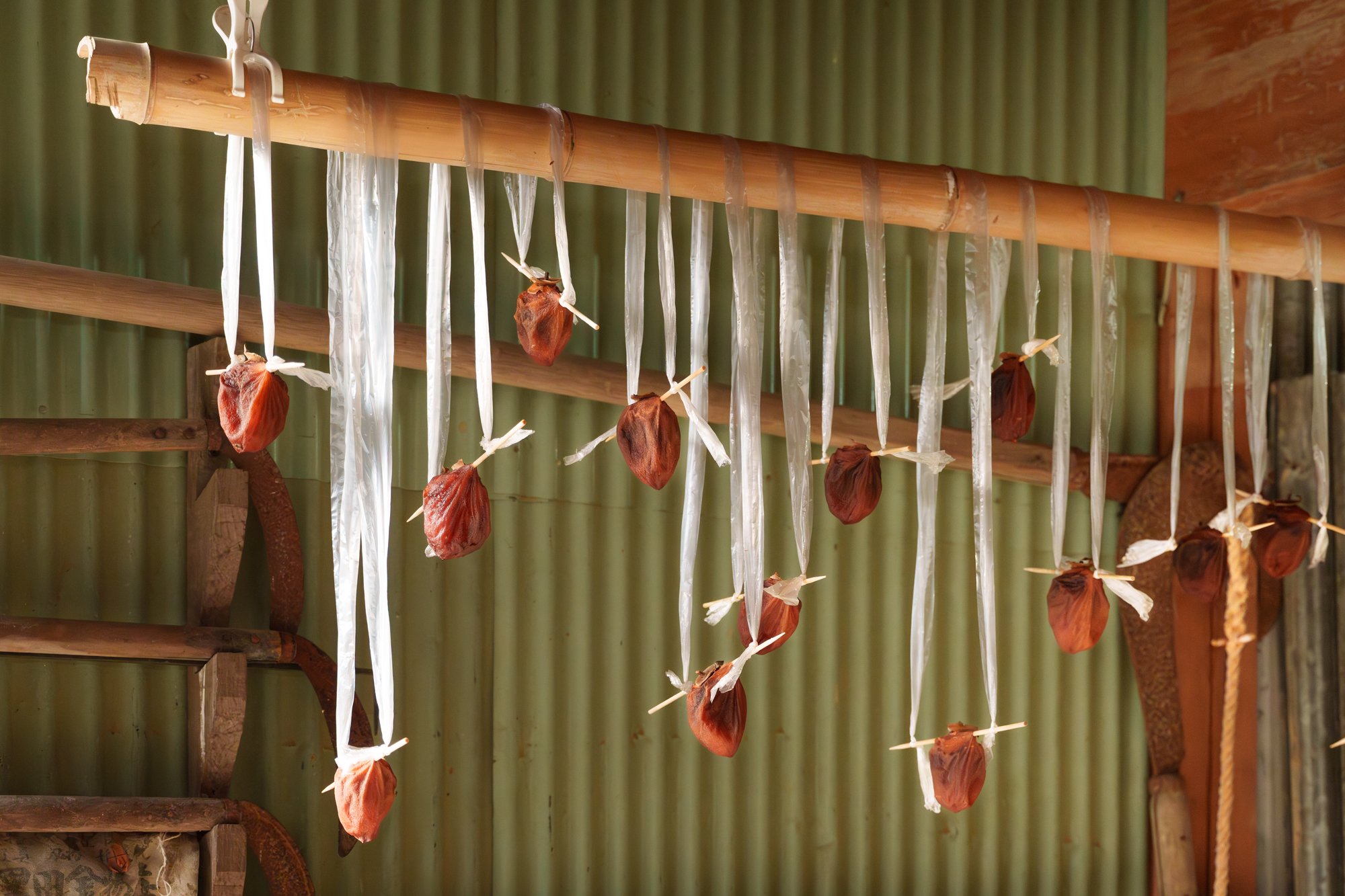 近所の方からいただいた柿で干し柿を。梅をもらえば、梅干しや梅酒に。