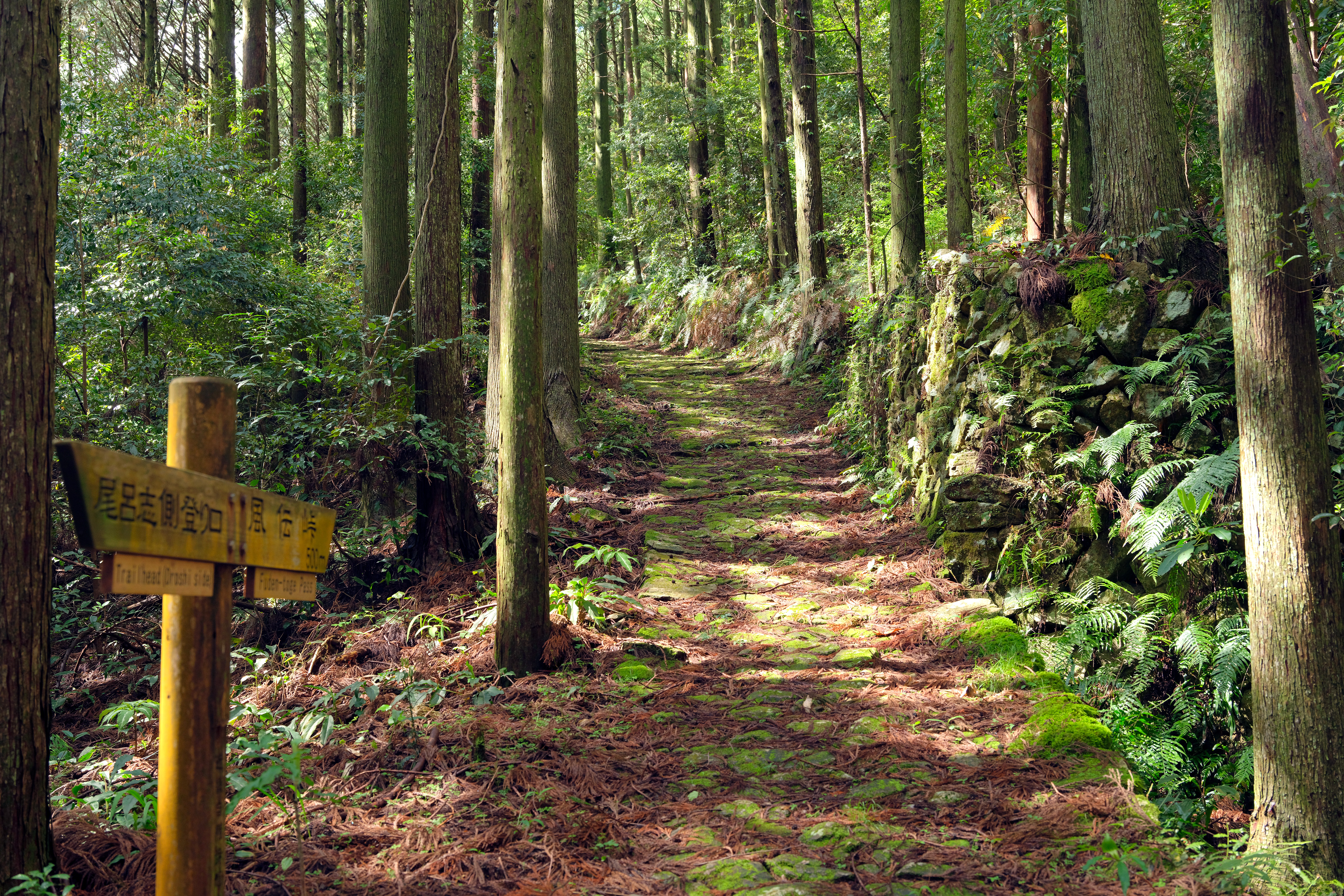 急峻な山道に人々がひとつひとつ敷き詰めた石畳が自然と見事に調和する姿は、先人たちの労力と厚い信仰心を物語ると同時に、苔むした一枚一枚の石畳が悠久の時の流れを教えてくれます。
